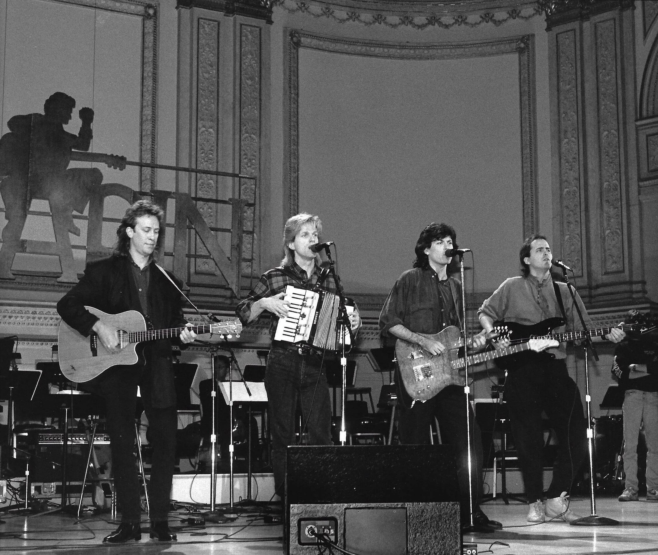 It was also during this time that the group was asked by Roger Waters of Pink Floyd to participate in his multimedia extravaganza "The Wall" in Berlin, 1990, to celebrate a unified Germany after the Wall came down. (Roger had met the band after catching a performance at London’s Town & Country Club.) The Hooters joined music legends such as Joni Mitchell, Van Morrison, The Band, Sinead O'Connor, Bryan Adams, and their friend Cyndi Lauper for an unforgettable musical experience at Berlin’s Potsdamer Platz, even traveling into former Communist East Berlin on the trip.