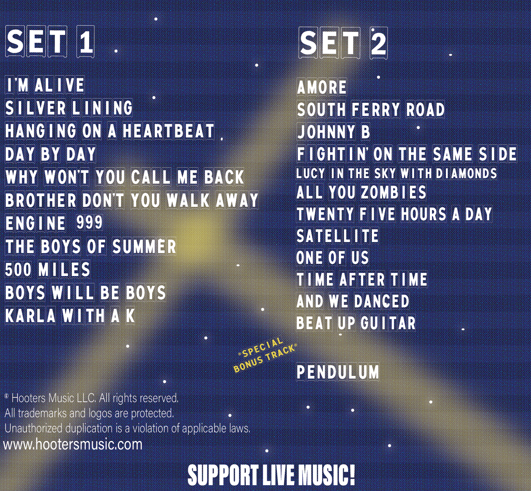 Recorded live at the Keswick Theatre, “45 ALIVE” brings you all the Hooterized hits and more. Not only does it feature a brand new horn section, the illustrious “Men In The Street”, as well as the band’s latest single “Pendulum”, but additionally a 12 pg booklet of liner notes and photos. As they wrap up their 45th Anniversary Tour, commemorating four decades of relentless touring, writing, and recording, the guys remain as dedicated as ever to their goal of celebrating live music wherever they go.